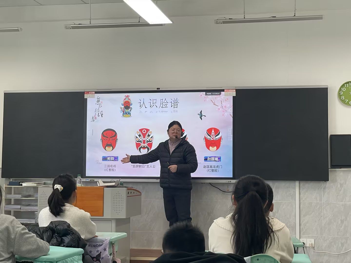 于丹丹老师以京剧脸谱为载体,从色彩寓意、谱式分类、人物性格等方面展开讲解,带领学生走进脸谱背后的戏曲世界。课堂通过生动的图像展示与互动问答,引导学生观察脸谱中的色彩美学与文化符号,感受传统艺术的独特魅力。