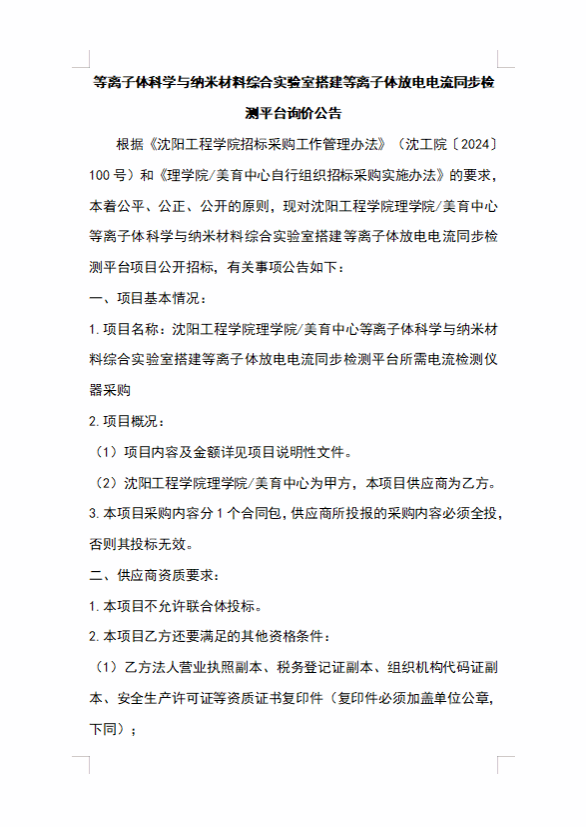 等离子体科学与纳米材料综合实验室搭建等离子体放电电流同步检测平台询价公告