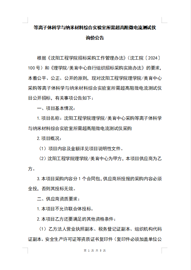 等离子体科学与纳米材料综合实验室所需超高阻微电流测试仪询价公告