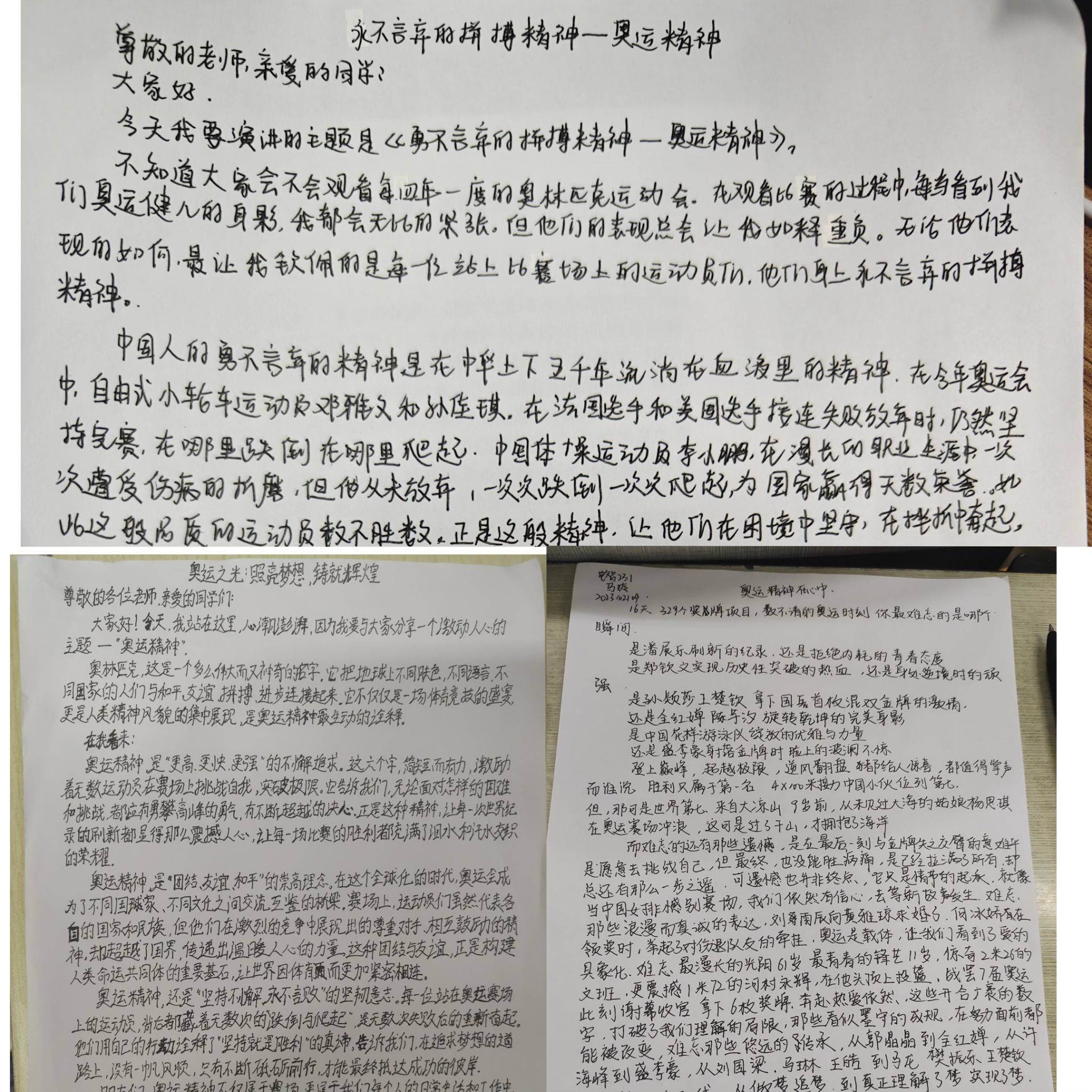 在制定本学期美育课程时,恰逢2024巴黎奥运会召开,中华体育精神来之不易,弥足珍贵,为将这种精神更好地继承创新,发扬光大,丰富美育教学的内容,助力落实立德树人根本任务,在《沟通艺术与应用写作》课中的演讲环节,特设置了“奥运精神”主题,并以此主题的演讲作为该环节的考核内容,通过安排学生手写讲稿和现场讲演,帮助学生理解运动规则和体育精神,提高学生对体育赛事的观察和分析能力,帮助学生通过体育与美育课程的学习,明确中华体育精神的深刻内涵及其重要性。