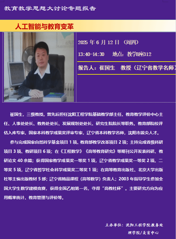 6月12日,betvlctor1946邀请辽宁省教学名师崔国生教授为全体教师做了题为“人工智能与教育大变革”的报告,启迪和指引全体教师要深刻理解好人工智能给教育教学带来的机遇和挑战,号召全体教师要爱岗敬业、把握机遇、乘势而上,在不断成长成熟过程中,为学校和部门高质量发展做出积极应有的贡献。