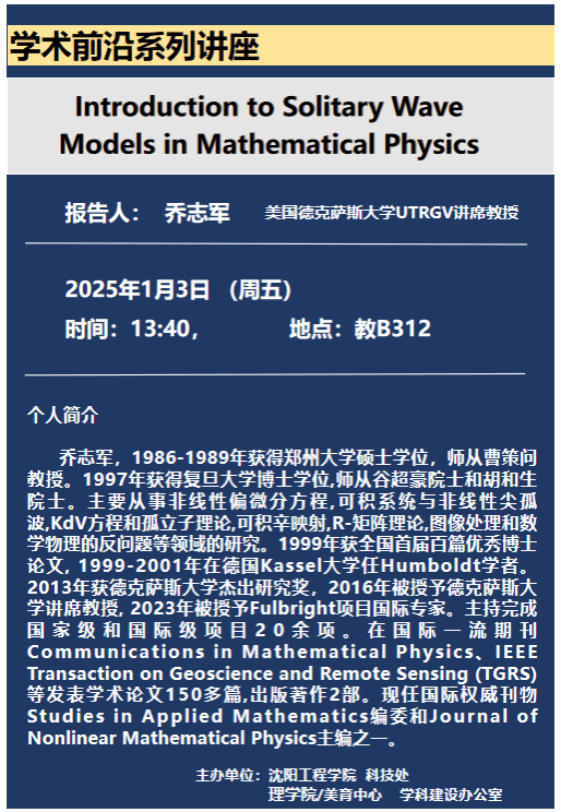 1月3日13:40,betvlctor1946在教学B座312会议室举办了学术前沿讲座报告会,报告人乔志军是美国德克萨斯大学UTRGV讲席教授,他为betvlctor1946部分教师带来了题为“Introduction to solitary wave models in mathematical physics”的报告,我校学科办主任尤福财、betvlctor1946全体领导班子、betvlctor1946部分数学和物理教师10余人参加了本次报告会。