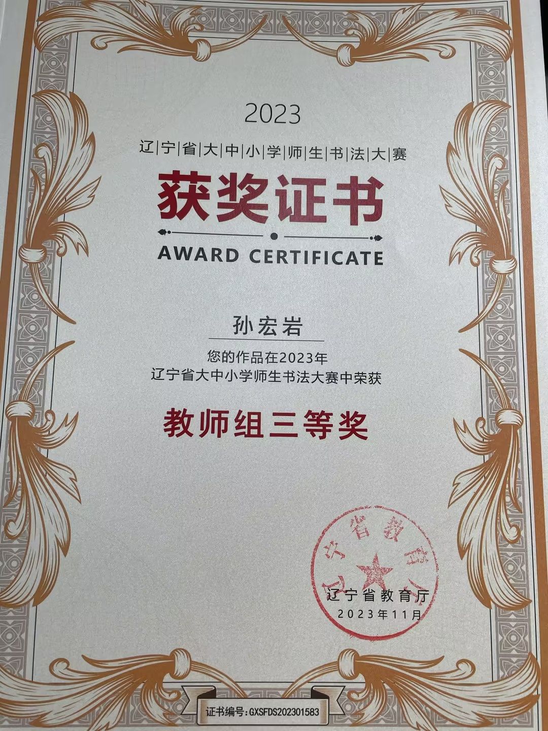 我校教师冉曙光、孙宏岩,分别在2023年辽宁省教育厅举办的“大中小学师生书法大赛”中获得教师组三等奖。