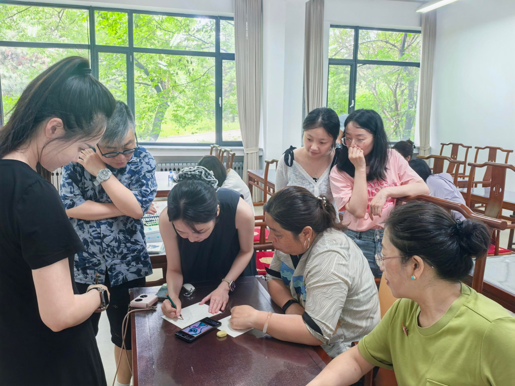 活动中,美育中心教师王子毅为教职工会员们带来了绘画技法的专业讲解,并现场进行示范教学,从构图、色彩运用到创作理念,与会员们分享了丰富的专业知识和实践经验。活动现场气氛活跃,教职工们踊跃提问,积极互动,在交流中提升了艺术修养和绘画技能。