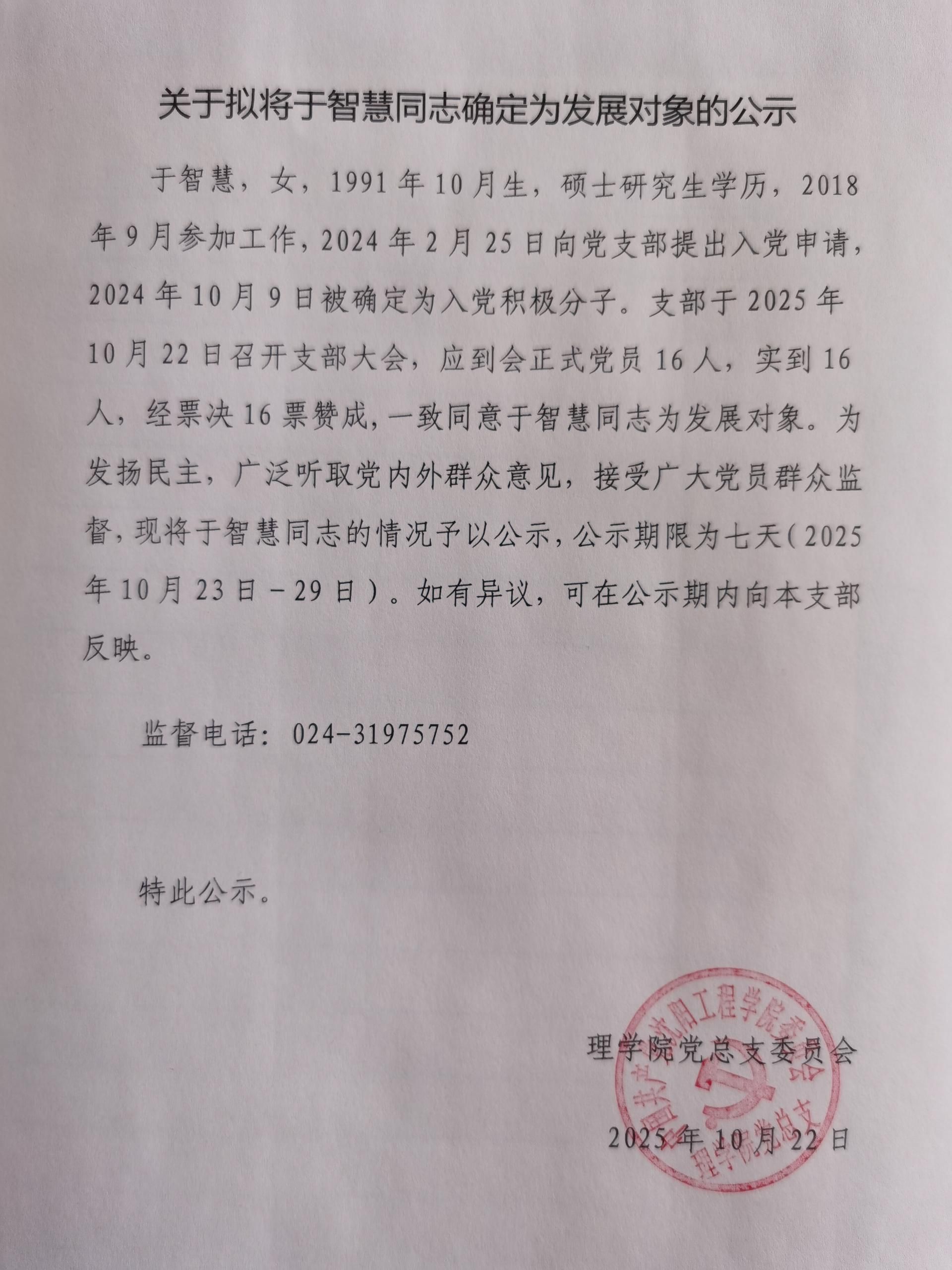 10月22日,数学党支部召开支部大会,应到会正式党员16人,实到16人,经票决,一致同意于智慧同志由入党积极分子转为党员发展对象,并依规进行公示。